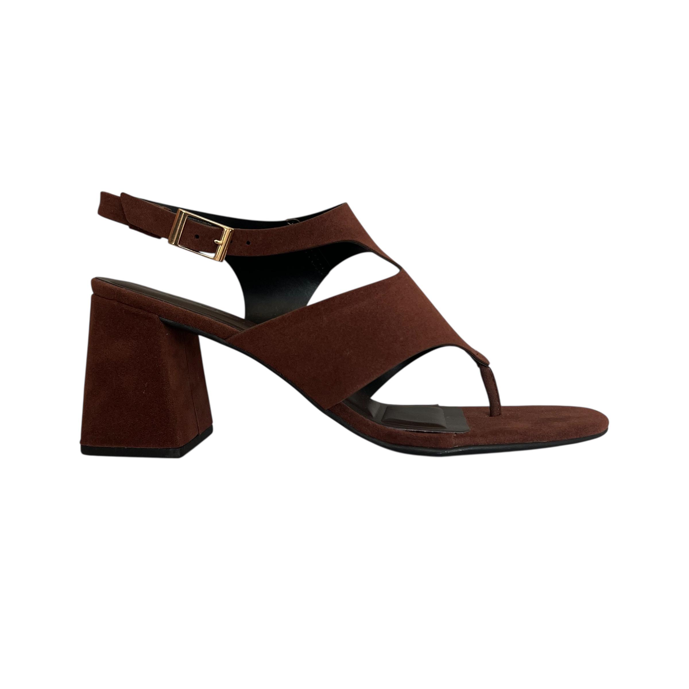 O salto bloco de 8 cm de altura garante conforto e estabilidade, sendo ideal tanto para o dia quanto para a noite. O fechamento em fivela dourada lateral complementa o acabamento refinado da peça, adicionando um brilho discreto e atemporal.