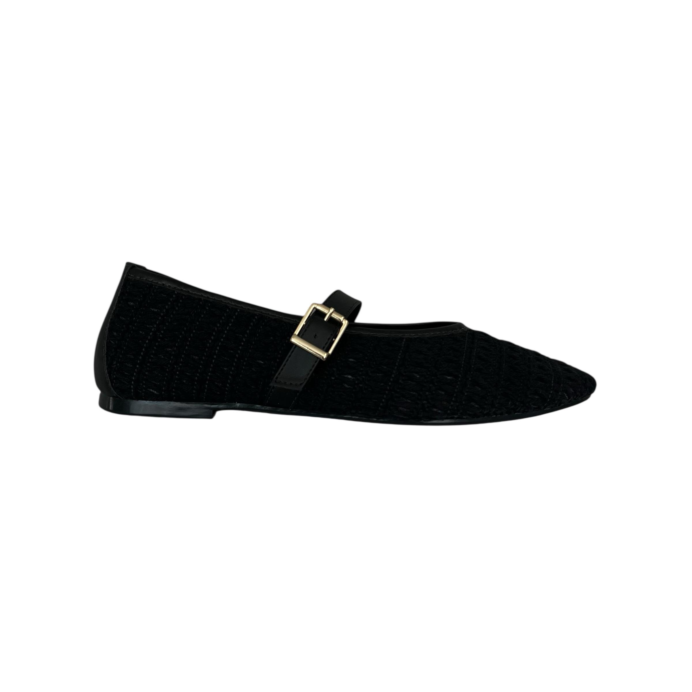 A tira em PU com fivela dourada permite ajuste perfeito aos pés, garantindo segurança ao caminhar sem abrir mão do conforto. O acabamento delicado evidencia o cuidado na fabricação e torna essa sapatilha uma peça única, versátil e cheia de personalidade.